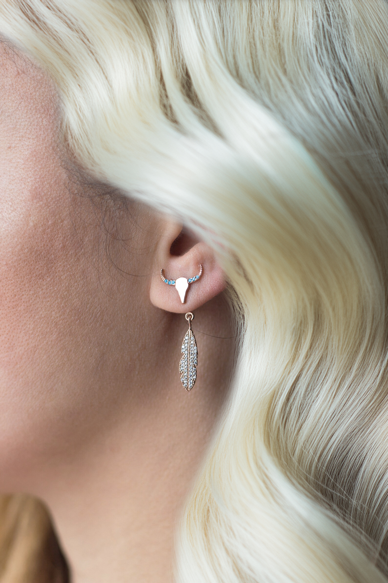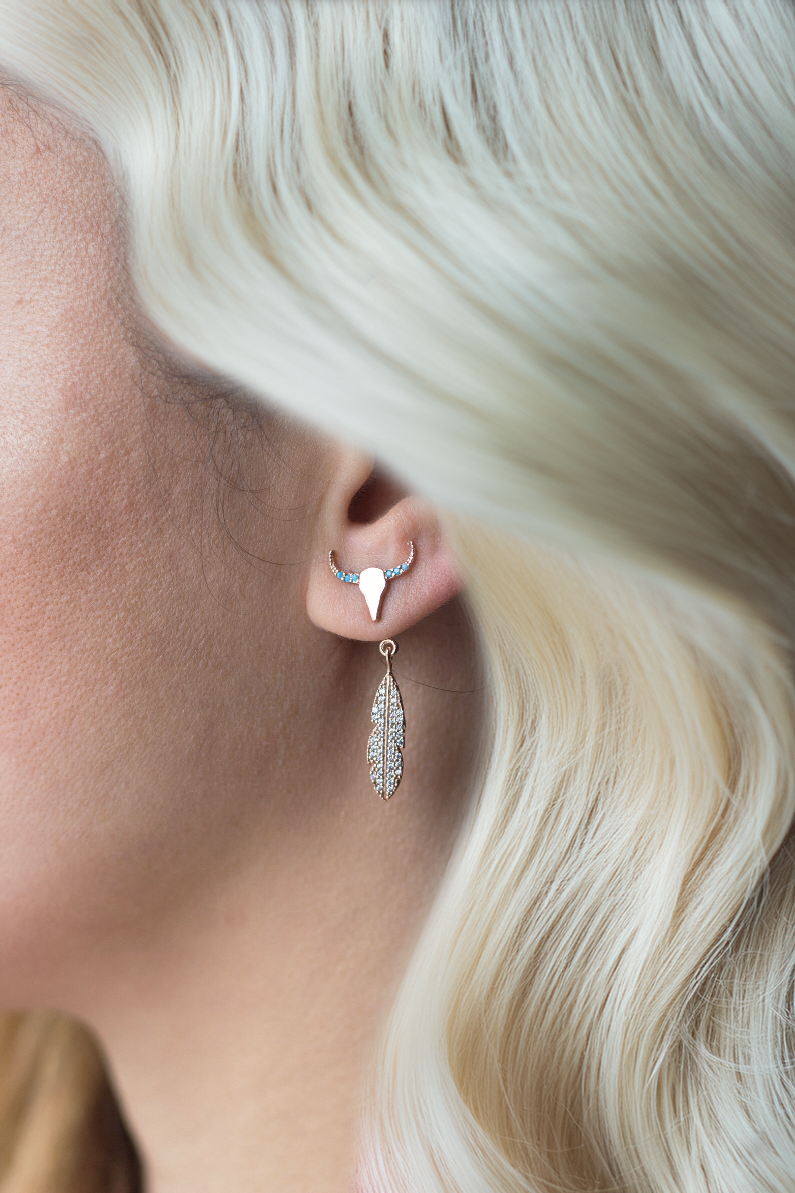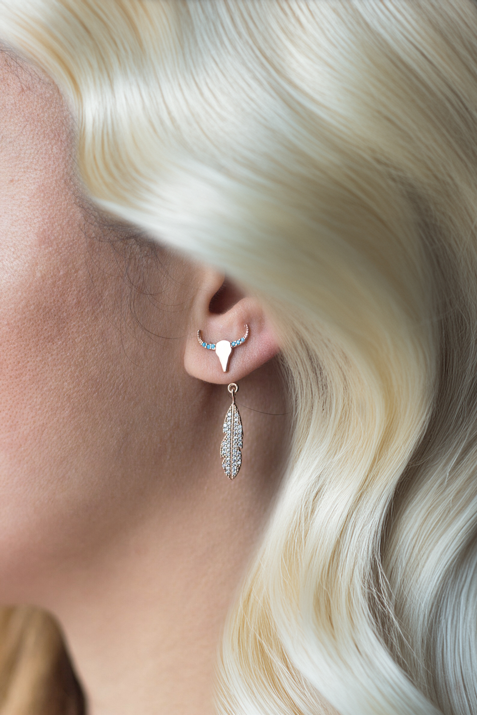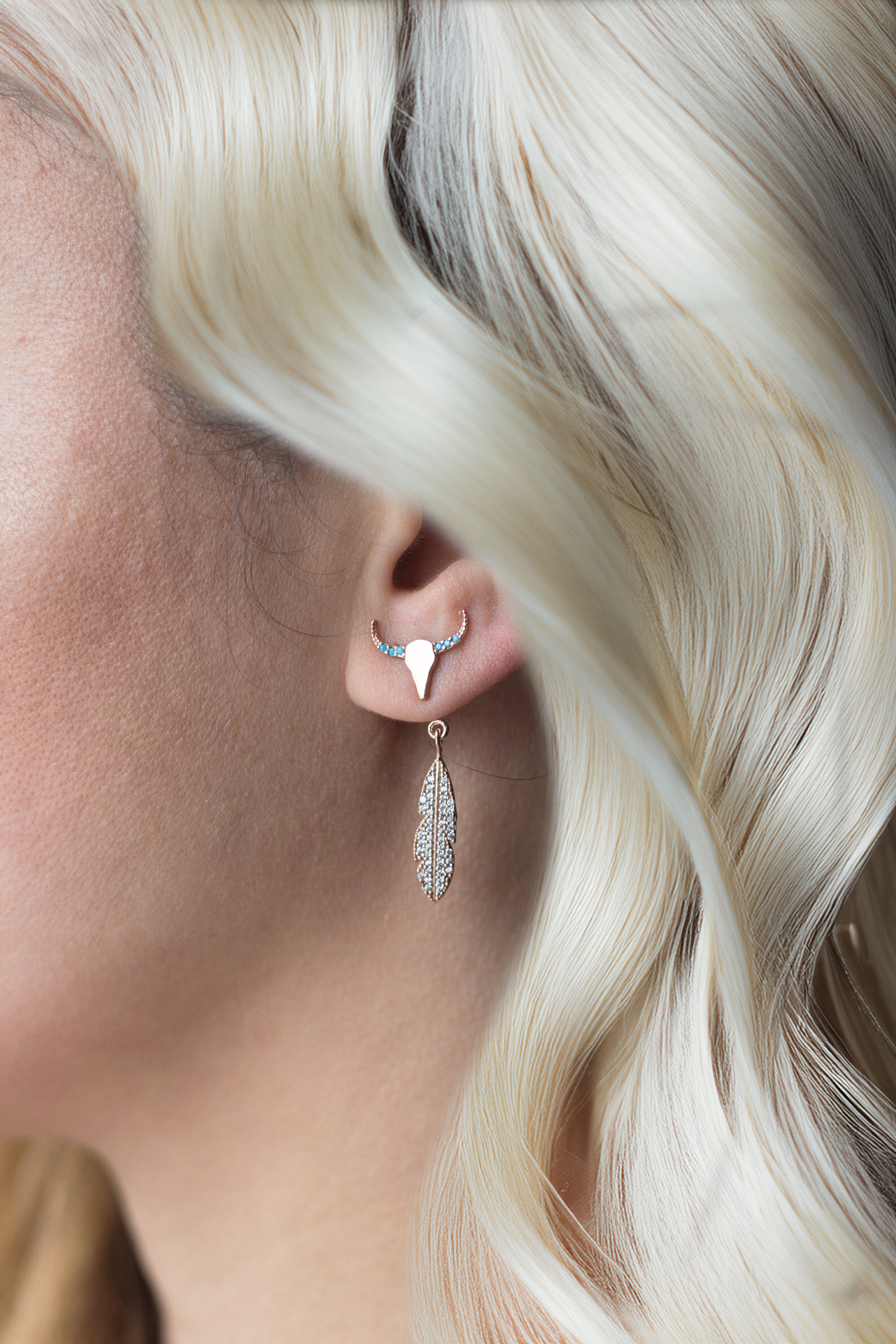 Turkuaz Taşlı boğa kafası ve kuş tüyü olmak üzere 2 parçalı bir ear jacket küpedir.