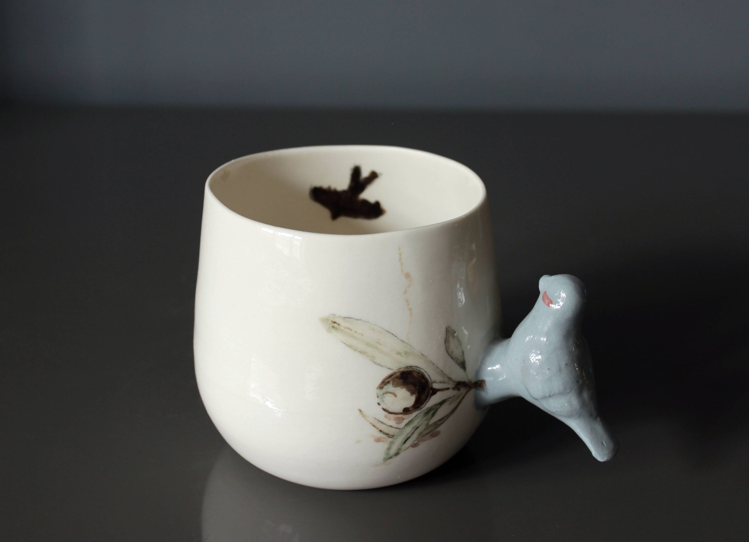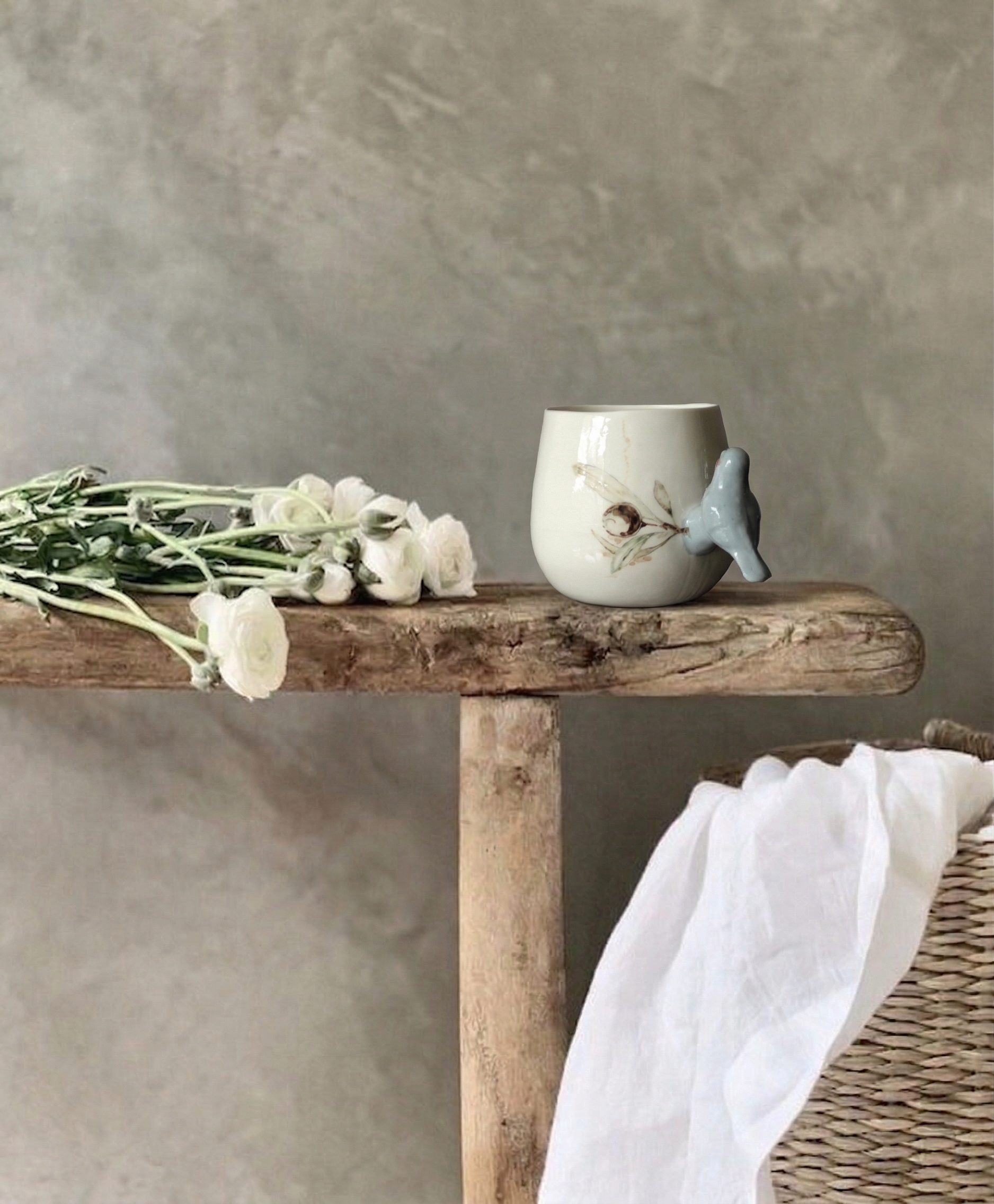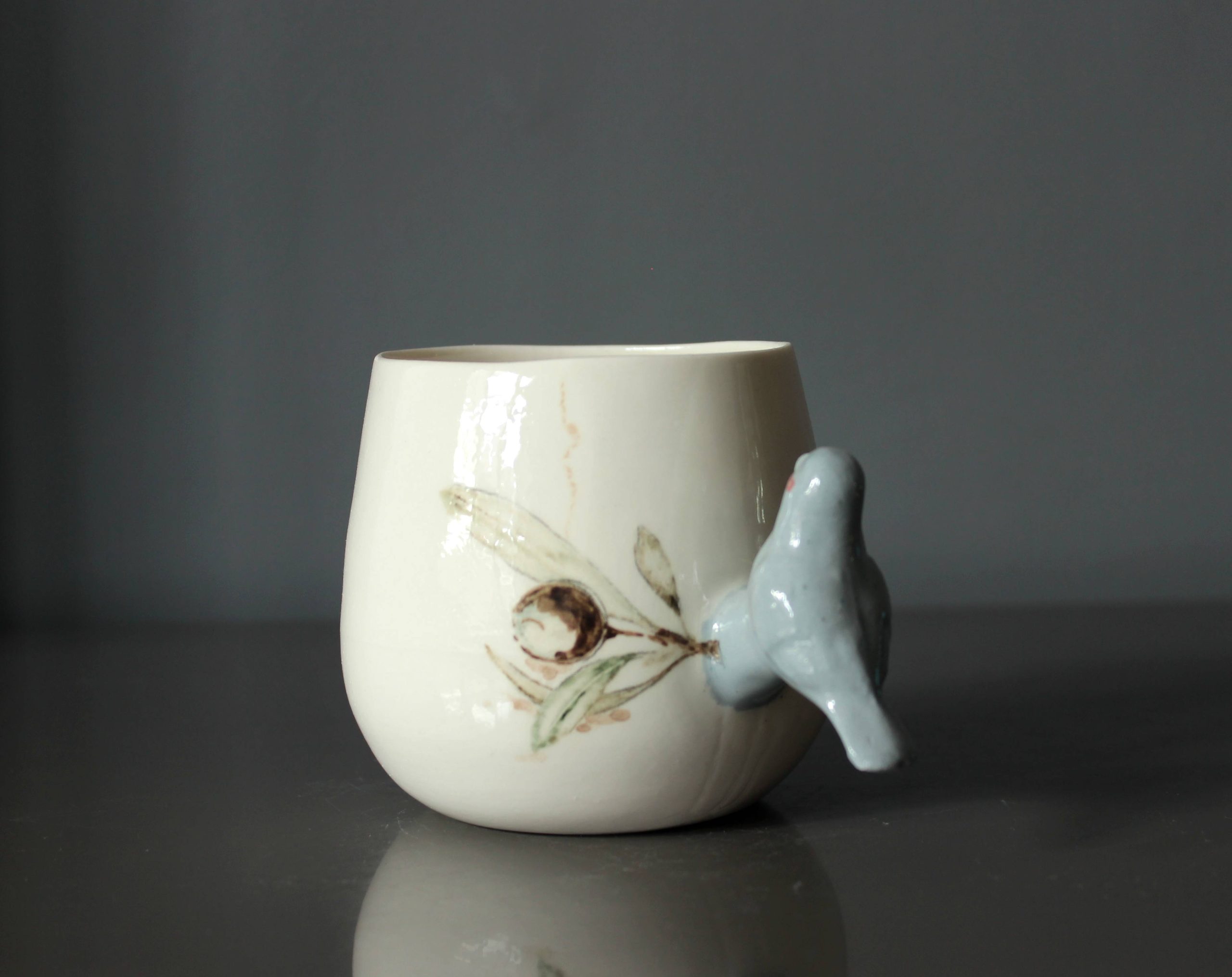 Doğadan ilhamla şekillenen bu özel porselen kupa, zarif bir zeytin dalı deseniyle bezenmiş ve sapı, el işçiliğiyle şekillendirilmiş üç boyutlu bir kuş figürüyle tamamlanmıştır. Kuşun dalda konmuş hali, sakinliğin ve özgürlüğün küçük bir yudumda hissedilmesini sağlar.