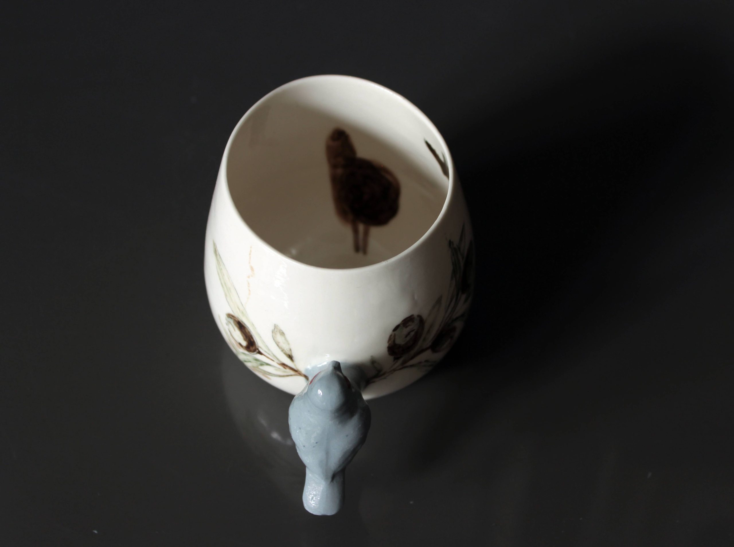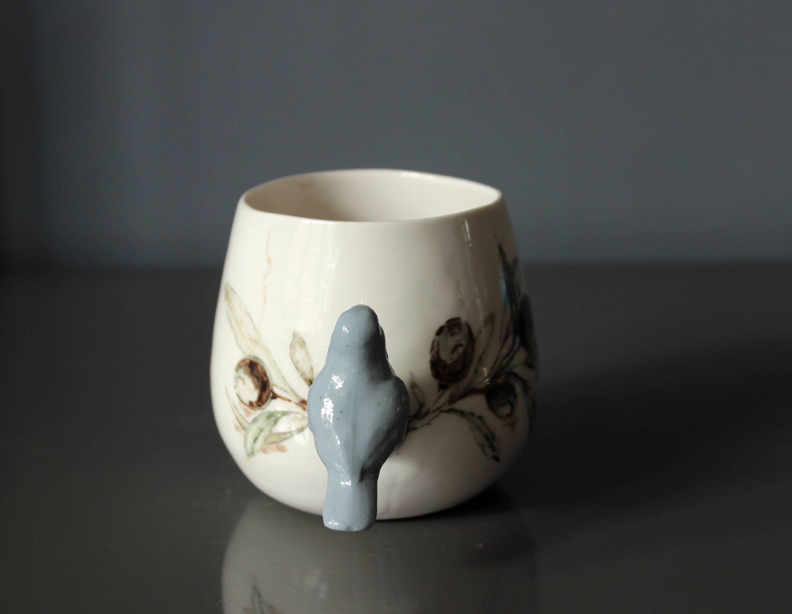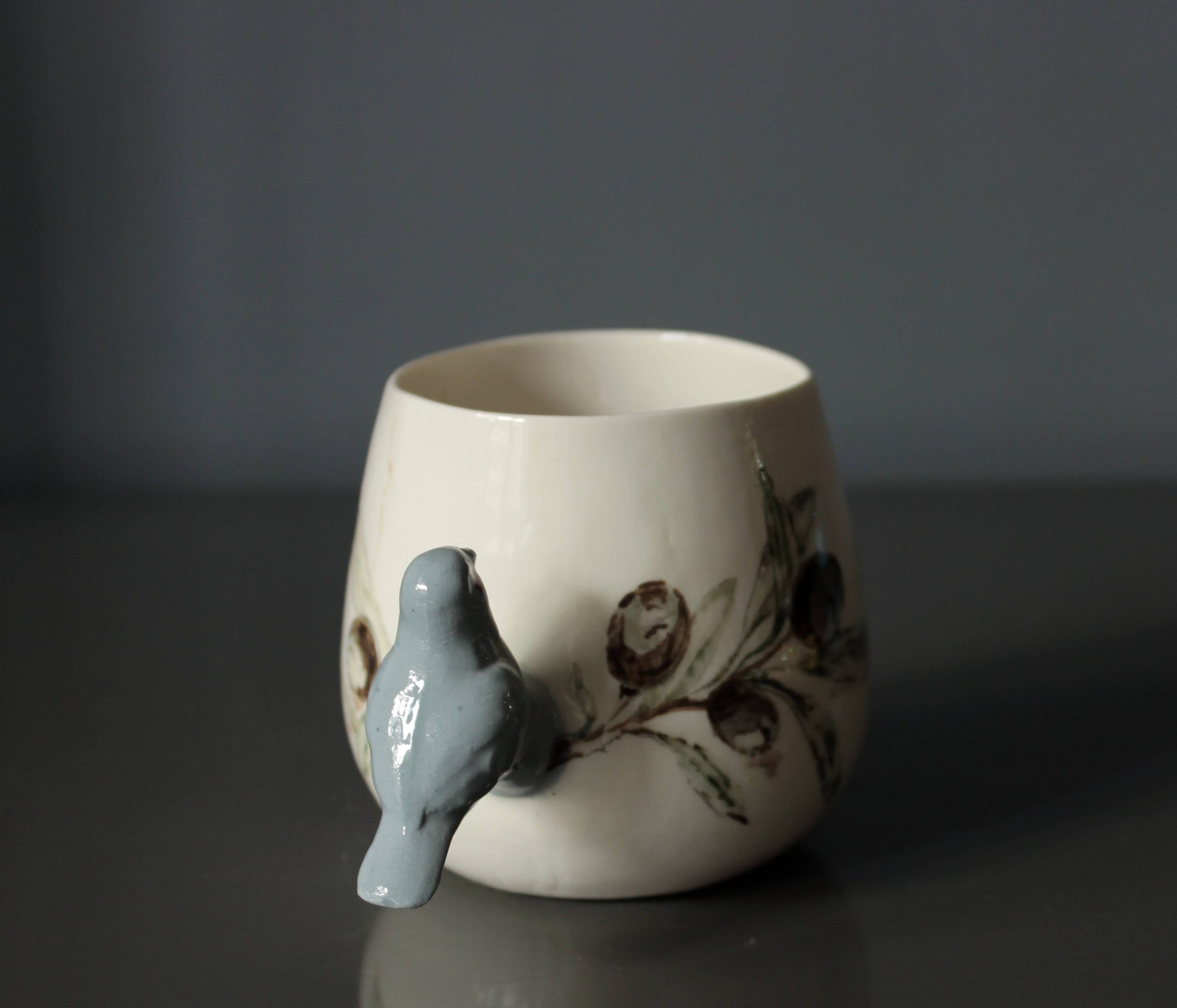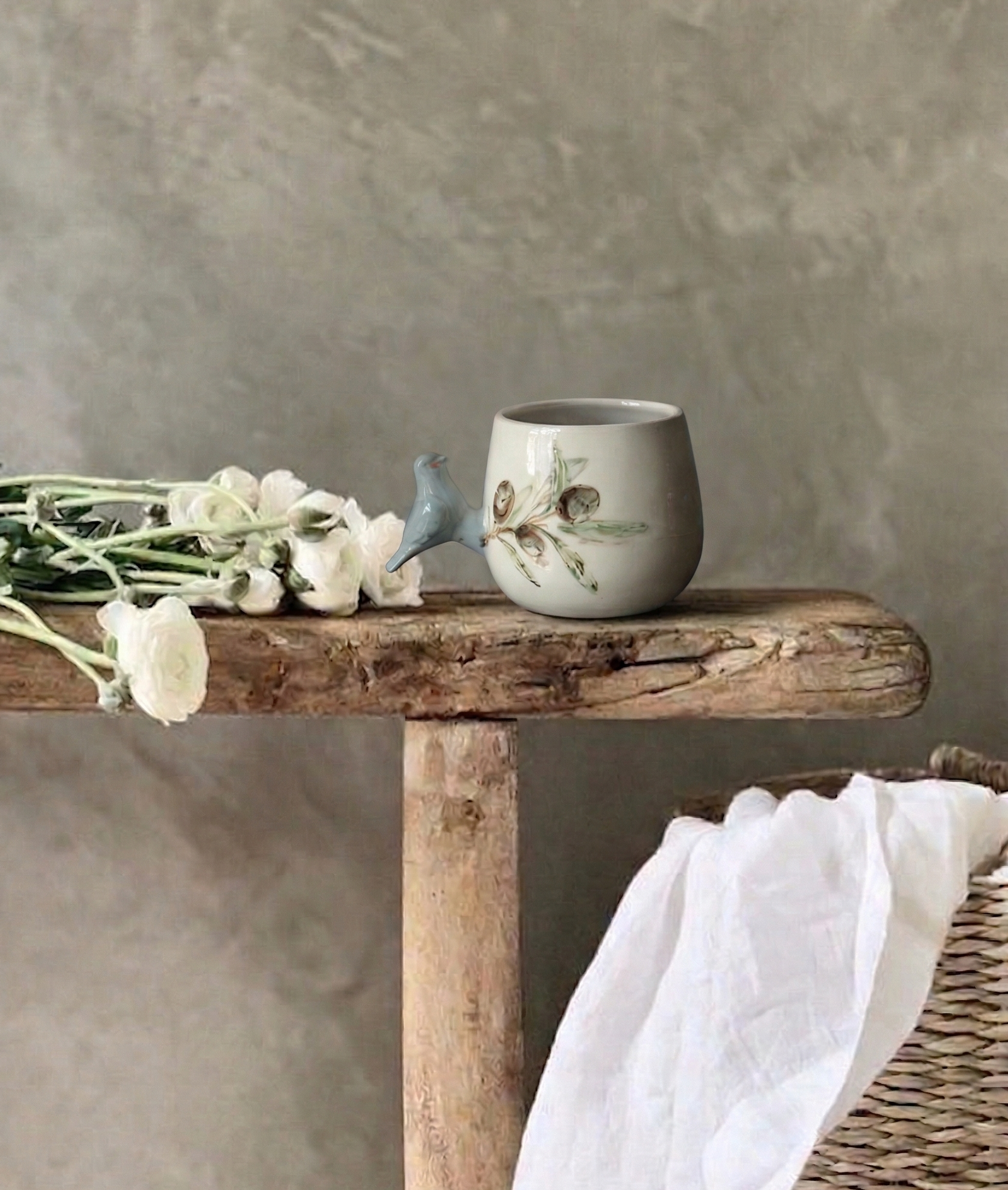 Doğadan ilhamla şekillenen bu özel porselen kupa, zarif bir zeytin dalı deseniyle bezenmiş ve sapı, el işçiliğiyle şekillendirilmiş üç boyutlu bir kuş figürüyle tamamlanmıştır. Kuşun dalda konmuş hali, sakinliğin ve özgürlüğün küçük bir yudumda hissedilmesini sağlar.