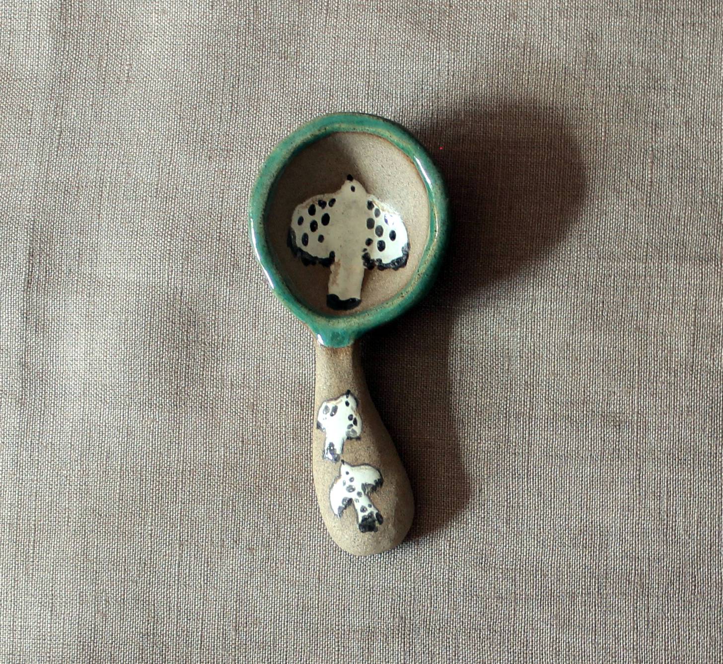 Bu el yapımı stoneware seramik kaşık, üzerindeki kuş desenleri ve toprak tonlarıyla mutfağınıza sade, şiirsel bir hava katar. Yeşil sırla çerçevelenen formu, içten gelen bir sıcaklık ve huzur hissi uyandırır.