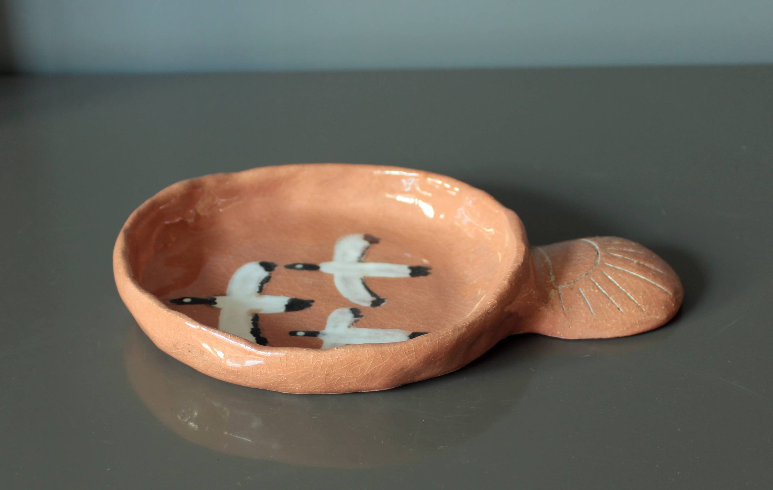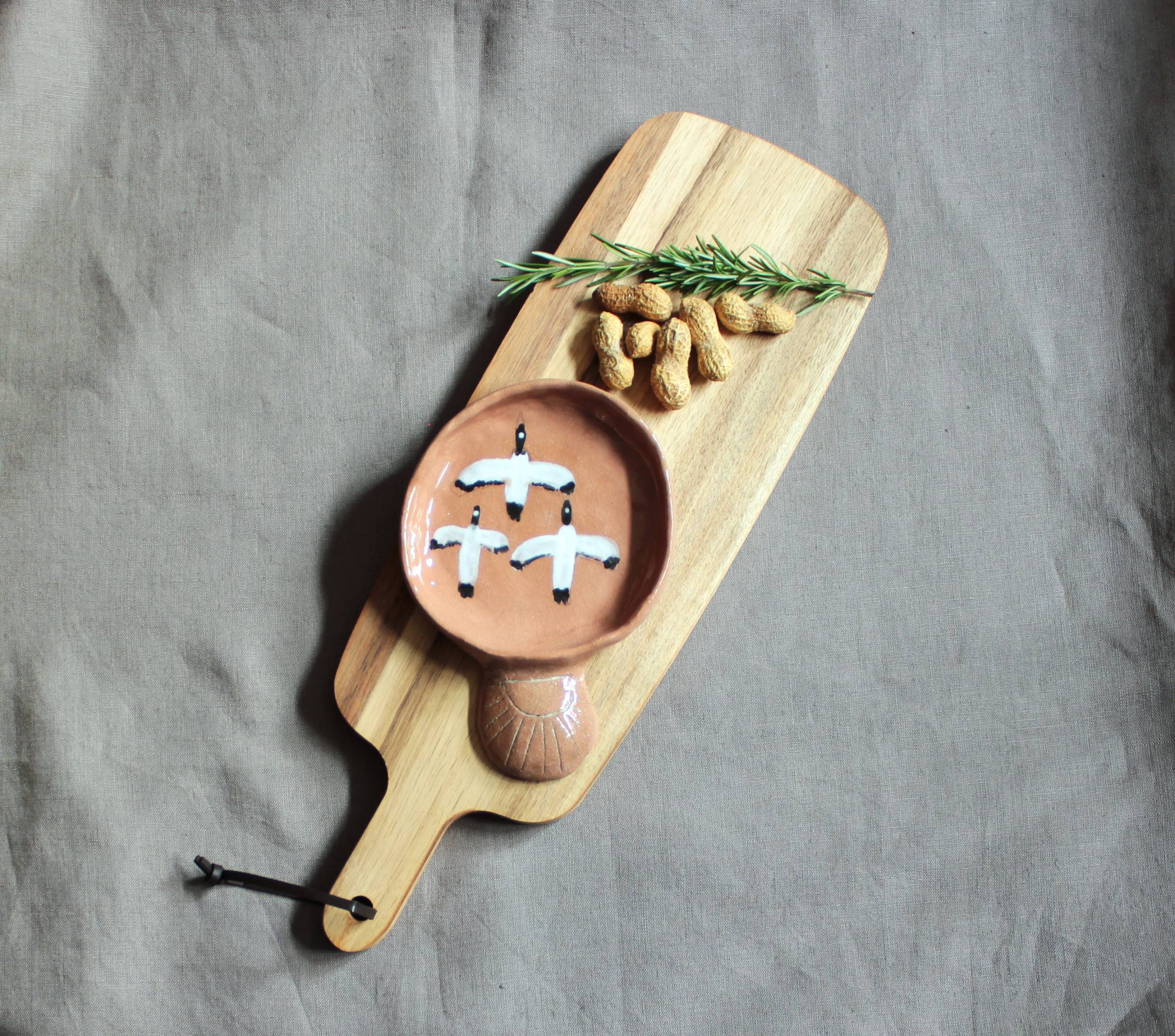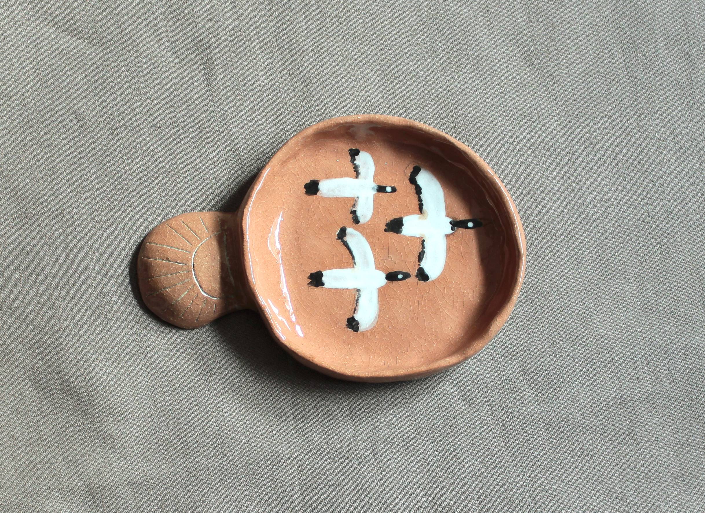 Gökyüzünde süzülen üç kuş figürüyle süslenmiş bu tabak, 1100°C’de pişirilmiş ve çatlak dokulu şeffaf sırla kaplanmıştır. Tek parça olarak üretilmiştir; benzeri yoktur. Doğal dokusu, ılık bir toprak tonuyla birleşirken, üzerindeki kuşlar sessiz bir göç yolculuğunu anımsatır.