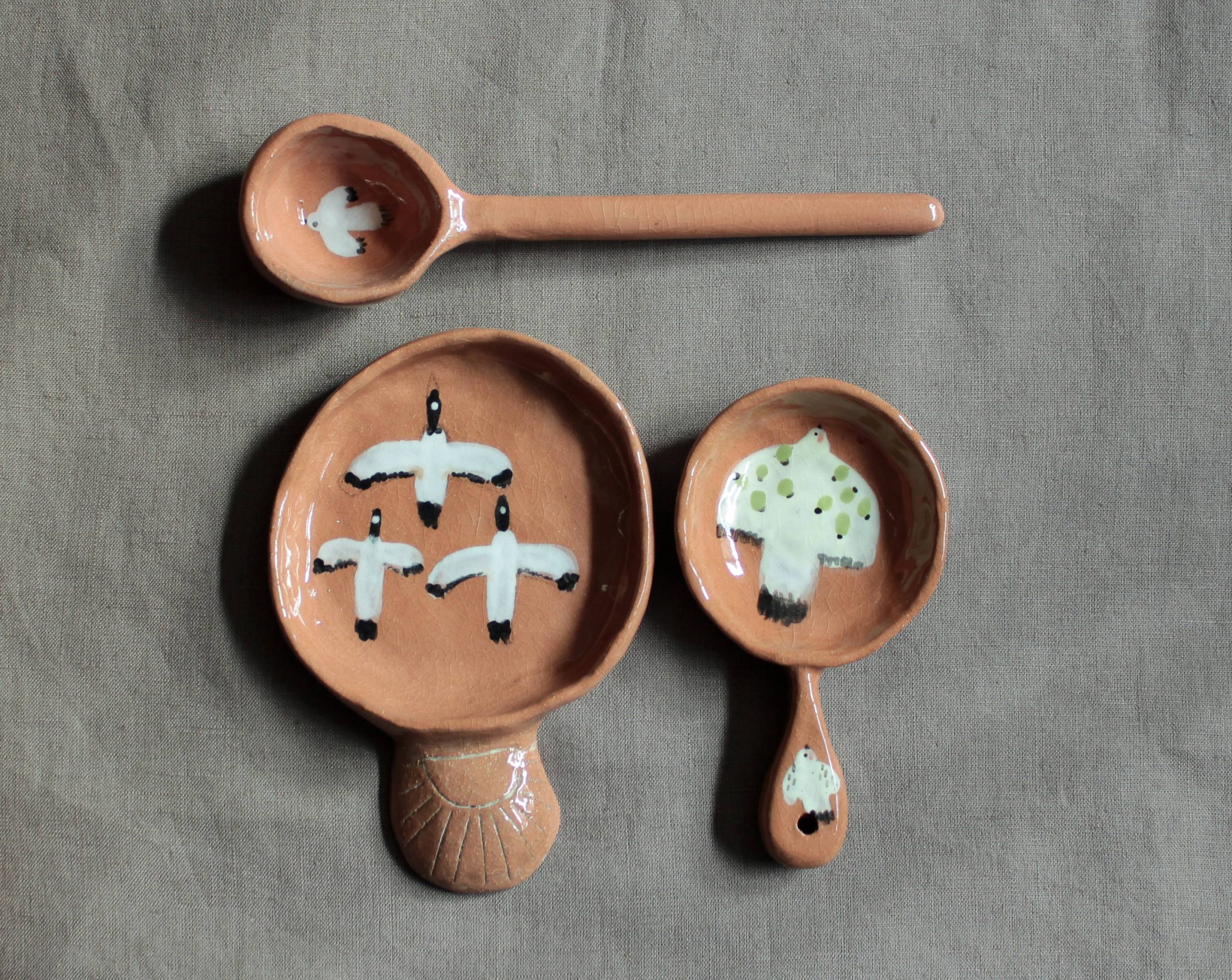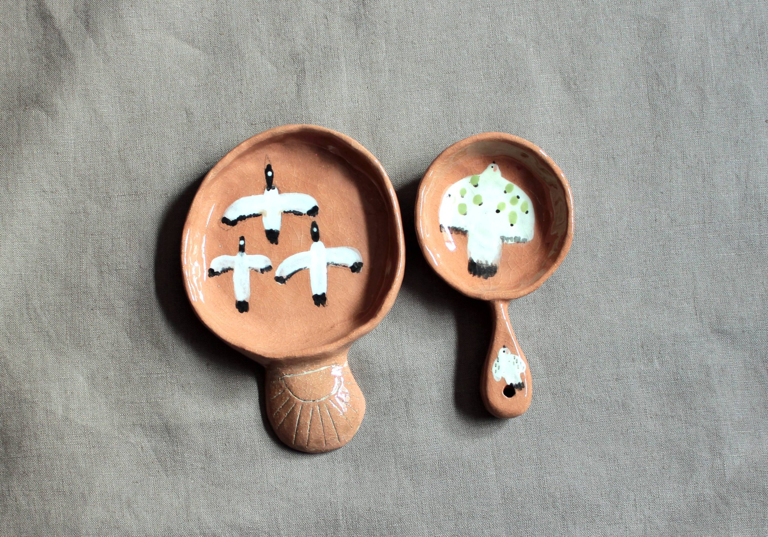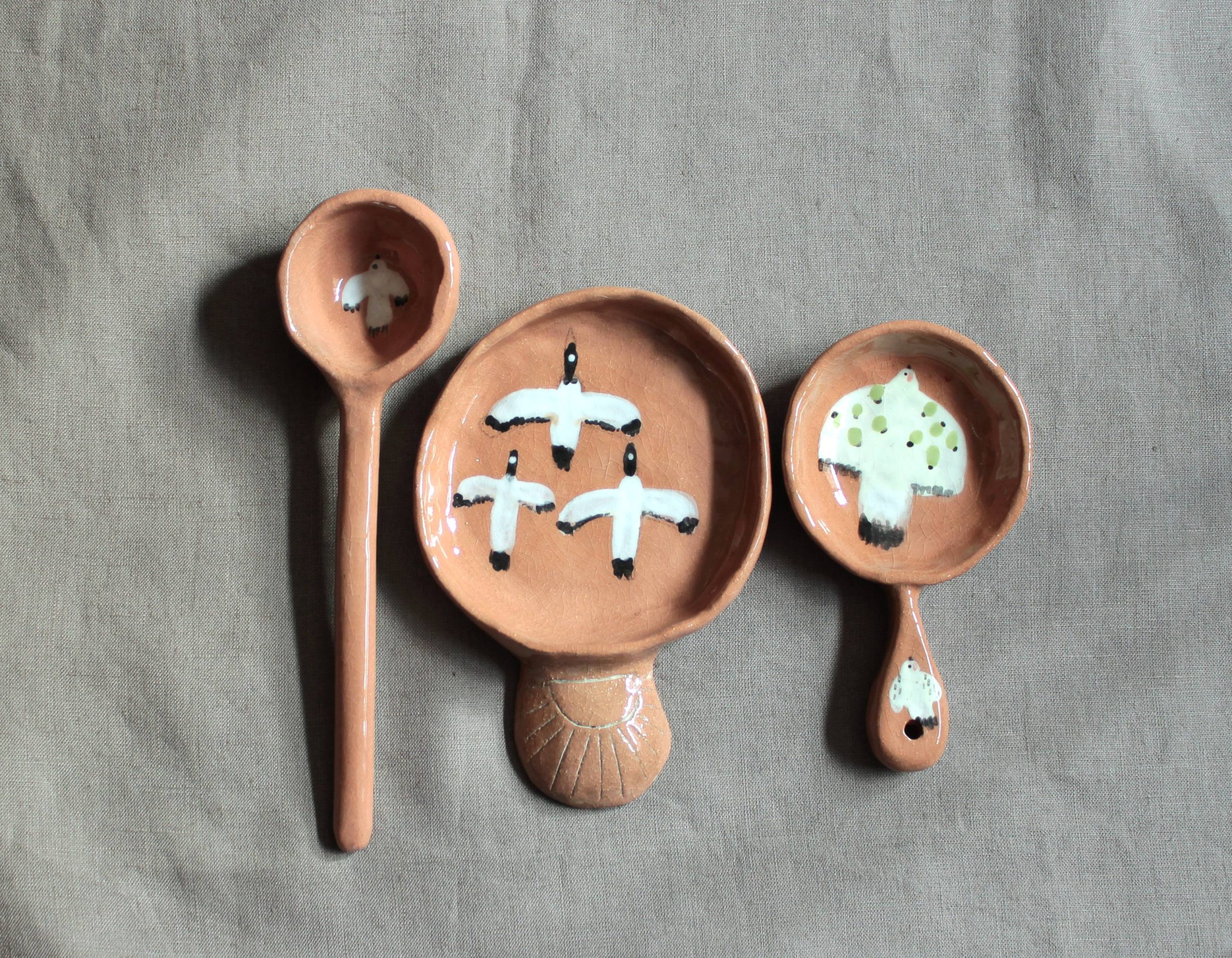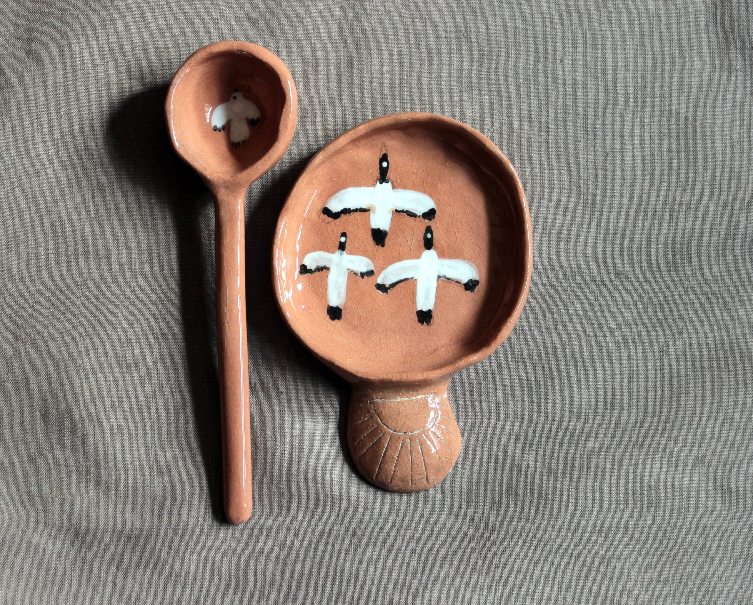 Gökyüzünde süzülen üç kuş figürüyle süslenmiş bu tabak, 1100°C’de pişirilmiş ve çatlak dokulu şeffaf sırla kaplanmıştır. Tek parça olarak üretilmiştir; benzeri yoktur. Doğal dokusu, ılık bir toprak tonuyla birleşirken, üzerindeki kuşlar sessiz bir göç yolculuğunu anımsatır.