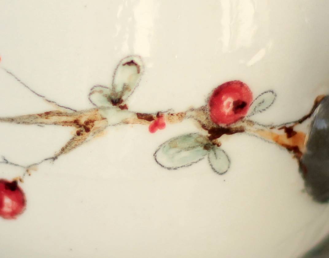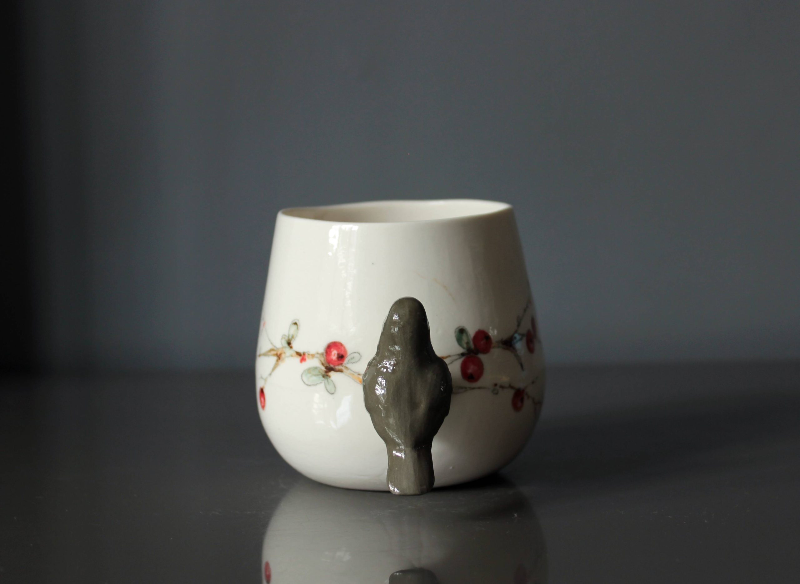 İncecik dallarda minik kırmızı meyveler… Ve bir kuş, usulca konmuş kupanın kenarına.