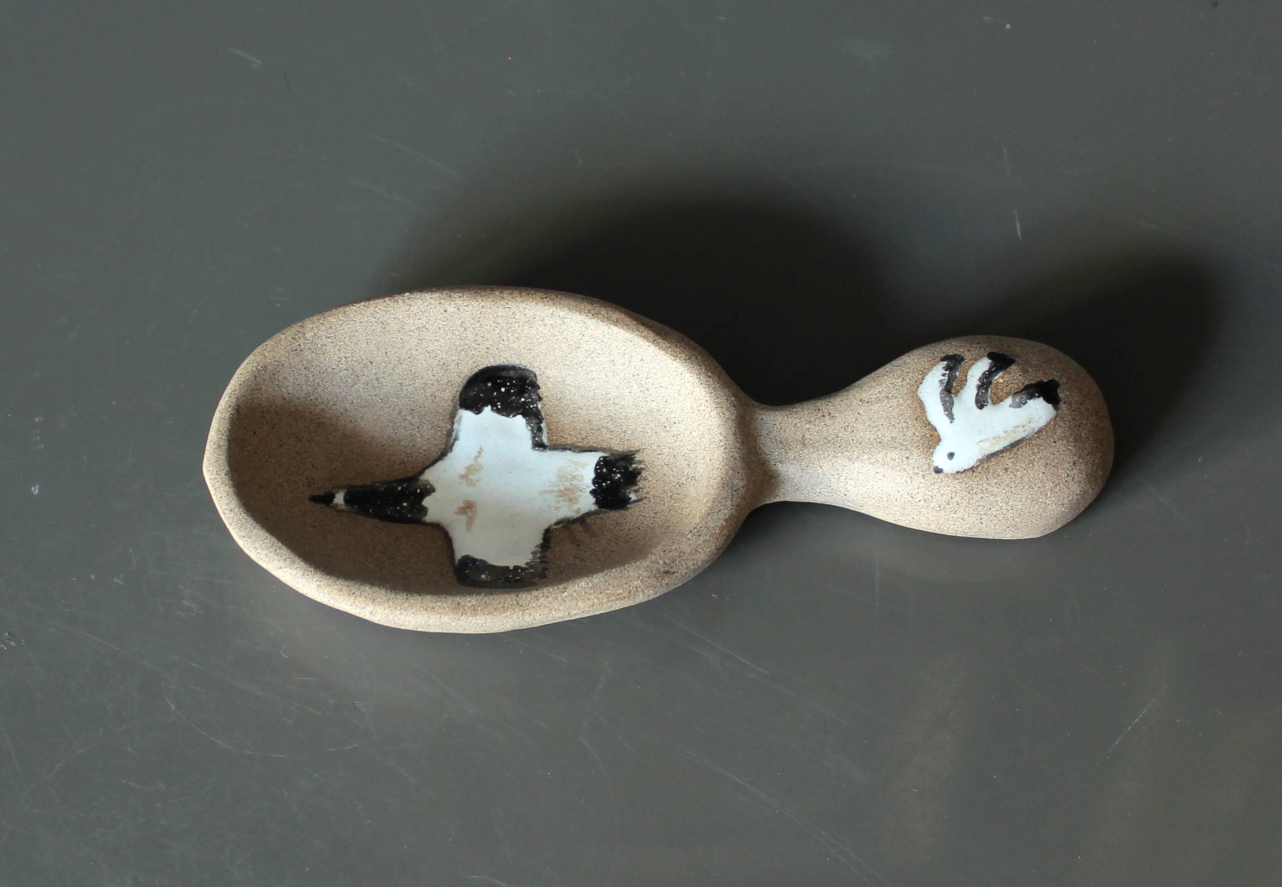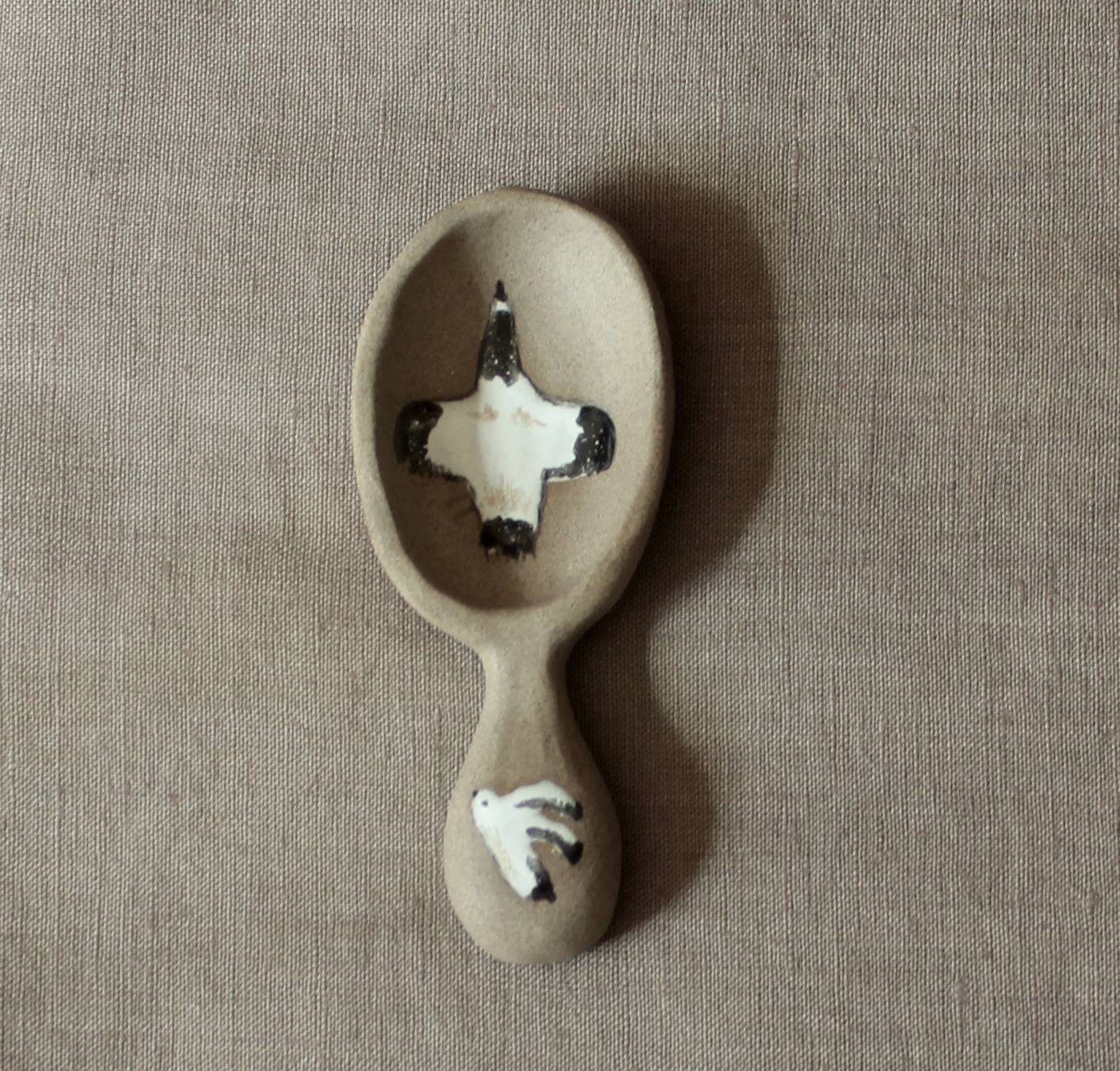 Kaşık, Sibelco gri çamurla elde şekillendirildi. Üzerindeki desen Amaco sırla elde çizildi; tamamen tekil ve özgündür. Yüzeyindeki matlık, rustik bir yaşamın dinginliğini yansıtır.