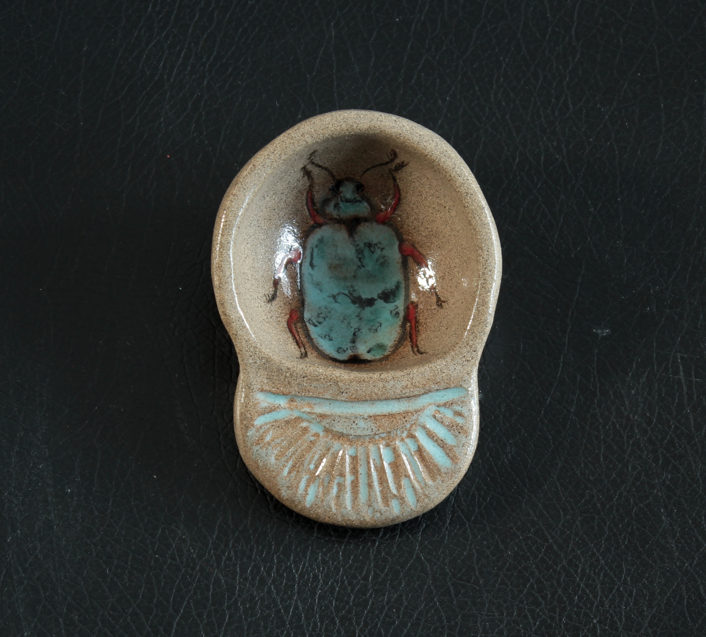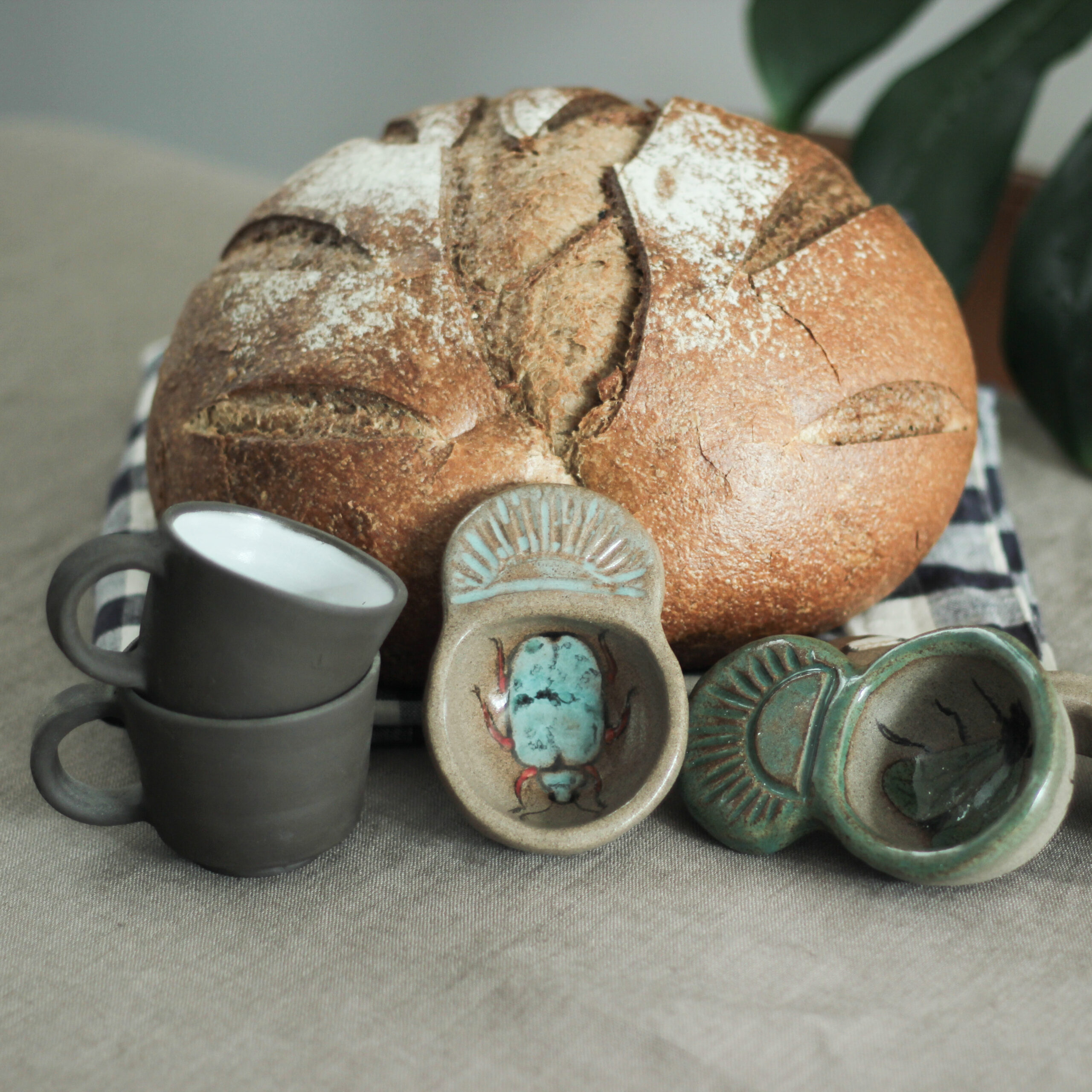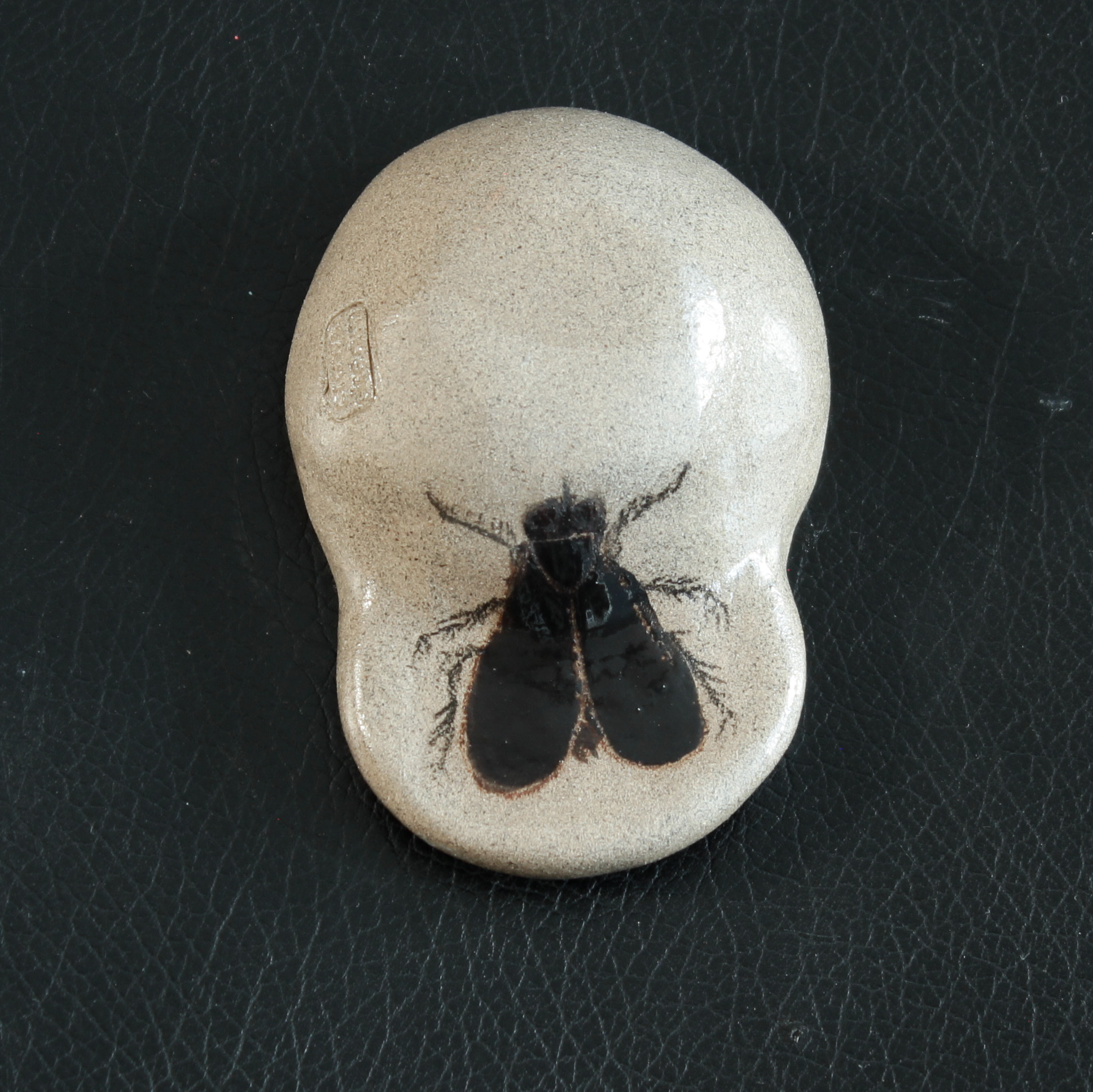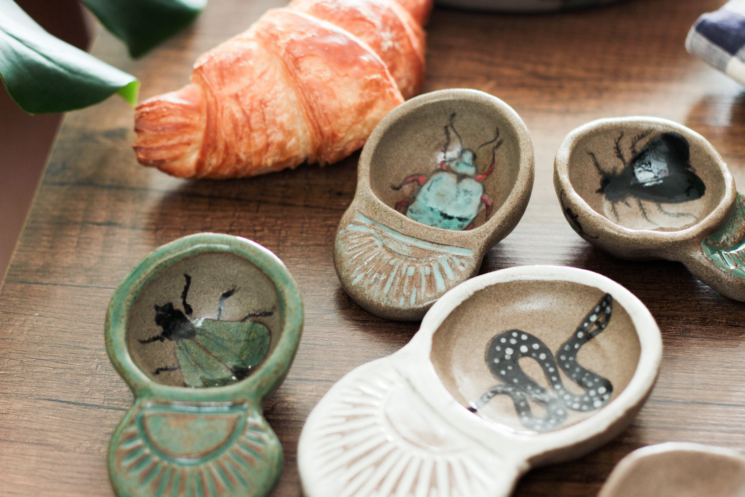 Gri stoneware çamurundan şekillenen bu 9.5 cm’lik küçük kaşık, yüzeyindeki mısır böceği ve altındaki sinek deseniyle doğanın döngüsünü evinize taşır.