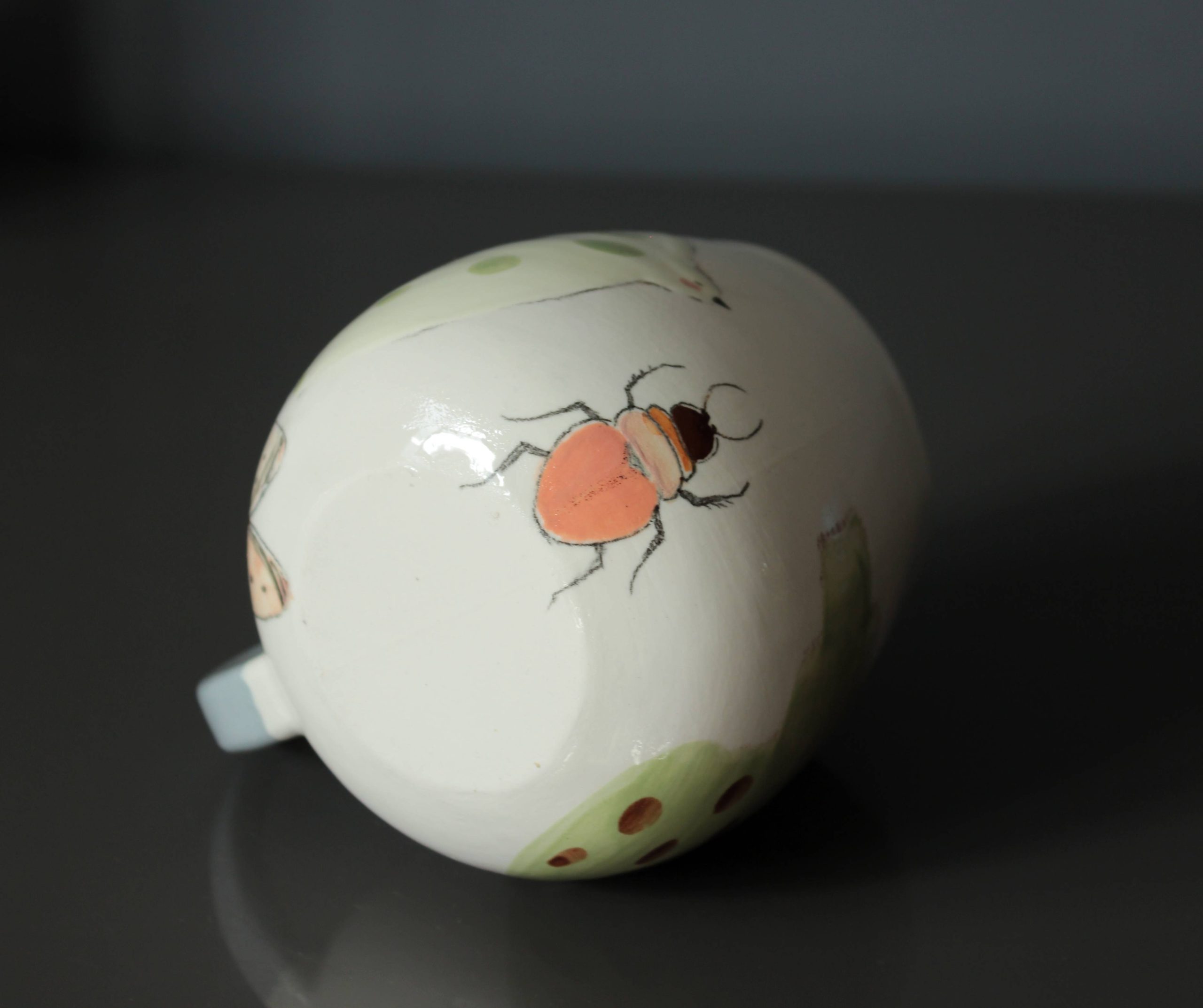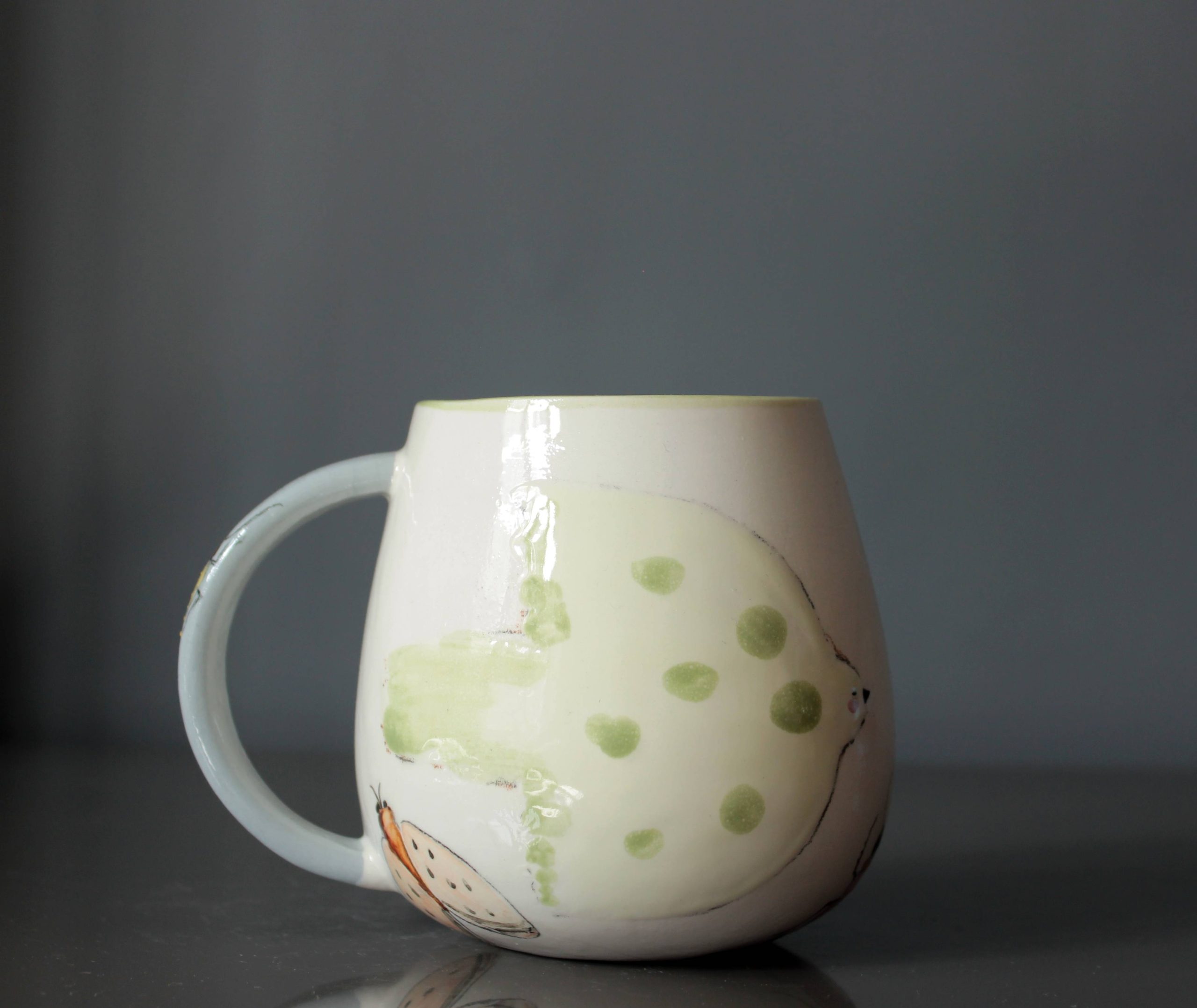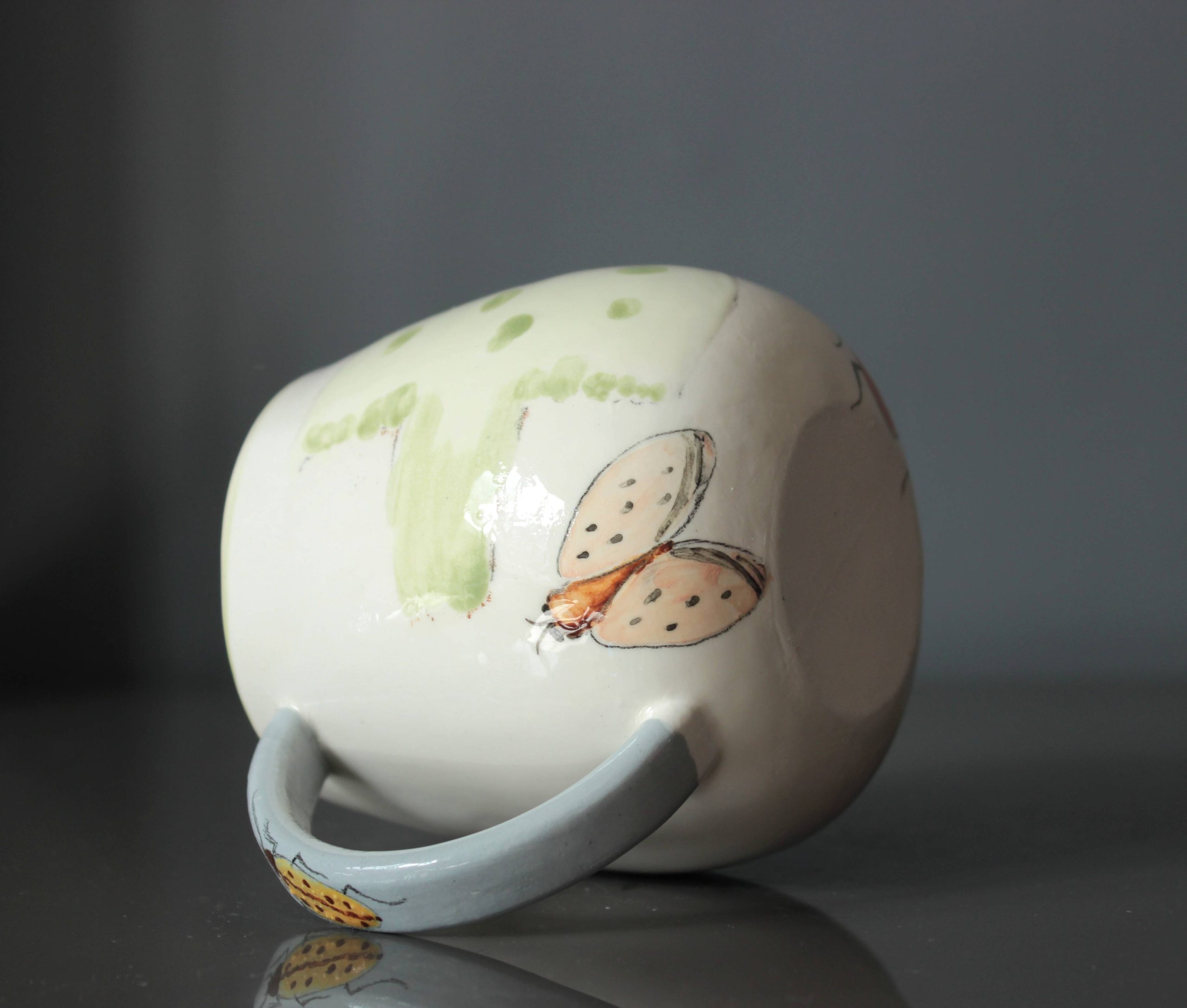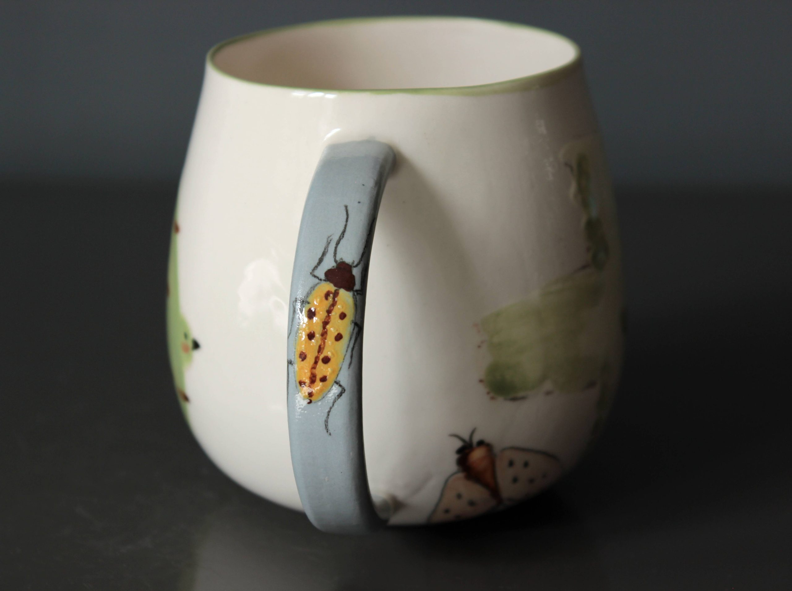 Bu el yapımı porselen kupa, doğanın zarif yaratıklarını taşıyor. Her iki yüzünde özgürlüğün simgesi büyük yeşil kuşlar uçuyor. Kulp kısmındaki sarı böcek ve altındaki turuncu böcek ile güve kelebeği, doğanın küçük mucizelerini ve renk cümbüşünü yansıtıyor. Her detay, benzersiz bir hikaye anlatıyor.