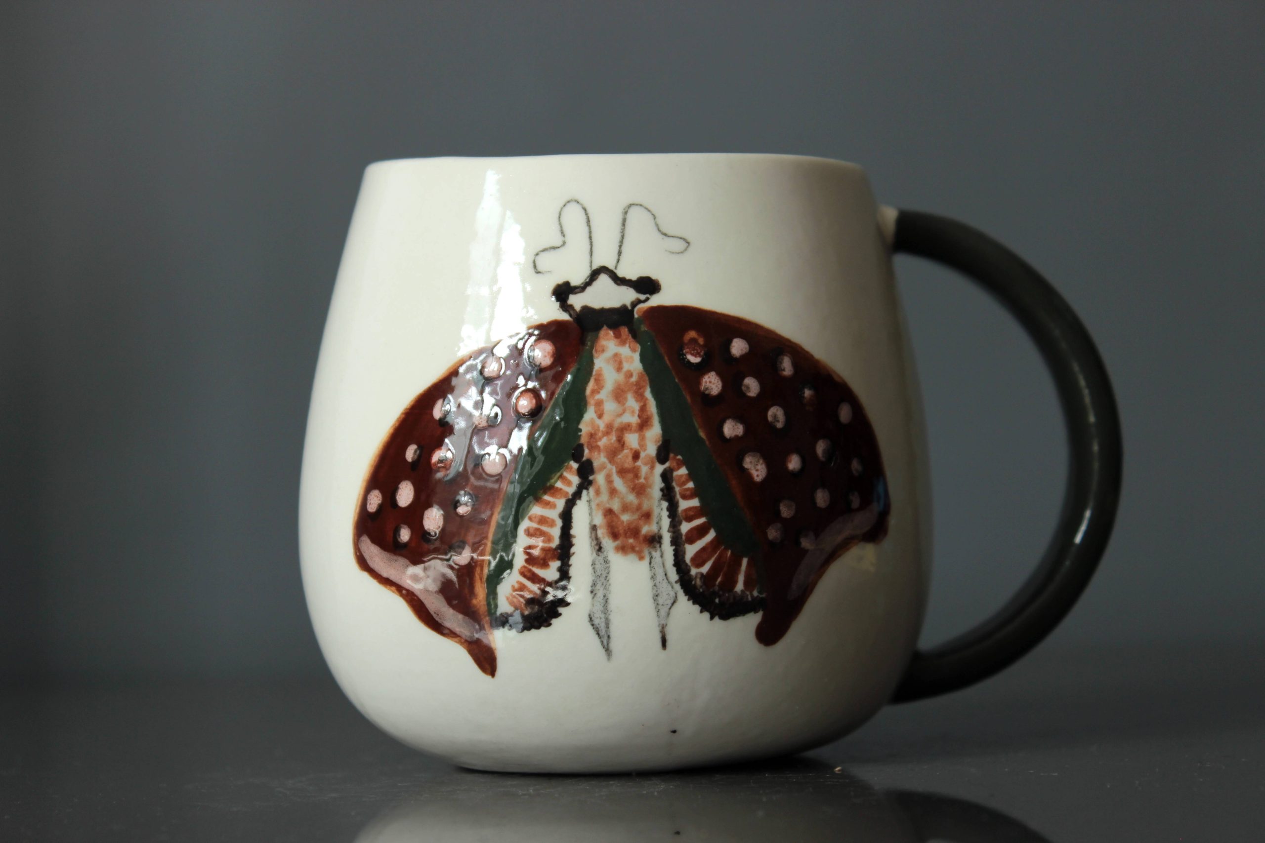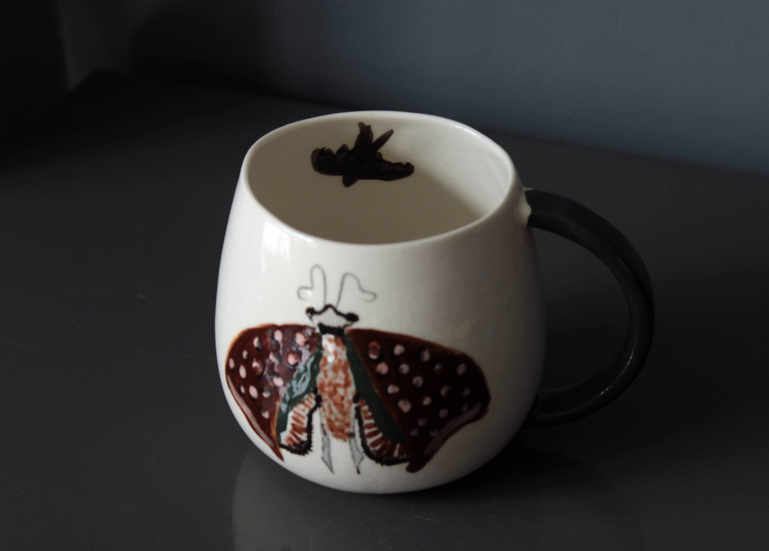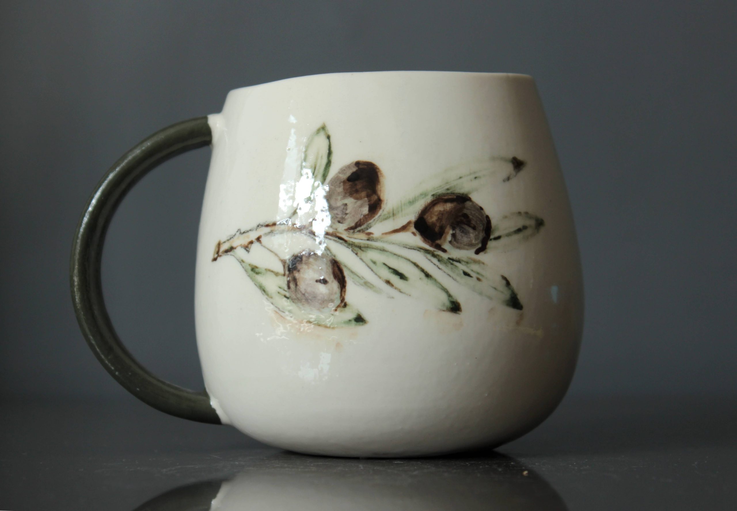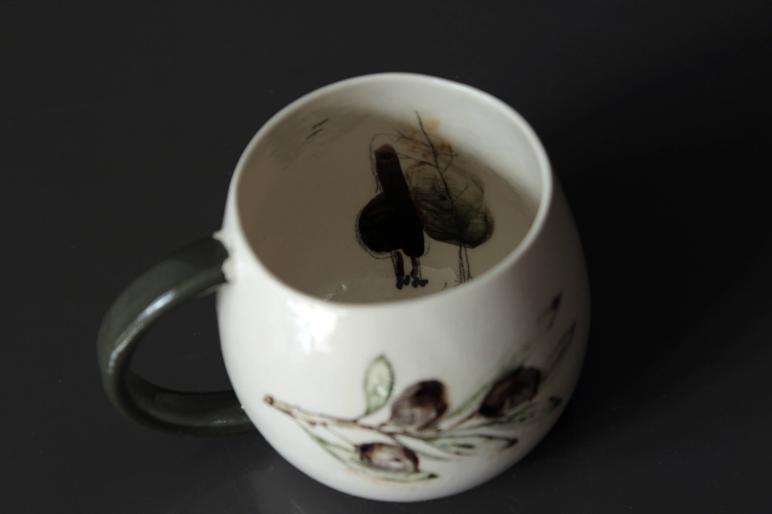 Zarif bir el işçiliğiyle tasarlanan bu özel porselen kupa, bir yüzünde zeytin dalı, diğer yüzünde ise uçan bir böcek motifiyle doğanın sakinliğini yansıtıyor. Kupanın içinde, ağaçlara doğru süzülen minik bir kuş betimlenmiş. 1200 derecede pişirilmiş ve el yapımının getirdiği hafif asimetri, ona benzersiz bir karakter kazandırıyor.